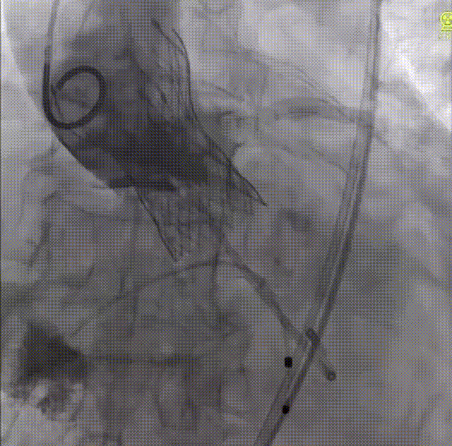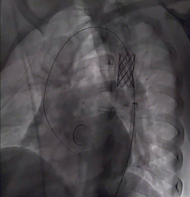 顺利完成CP支架组装后,经股动脉放置鞘管,成功将支架和球囊推送至血管缩窄段进行释放,血管造影结果提示预后效果理想。