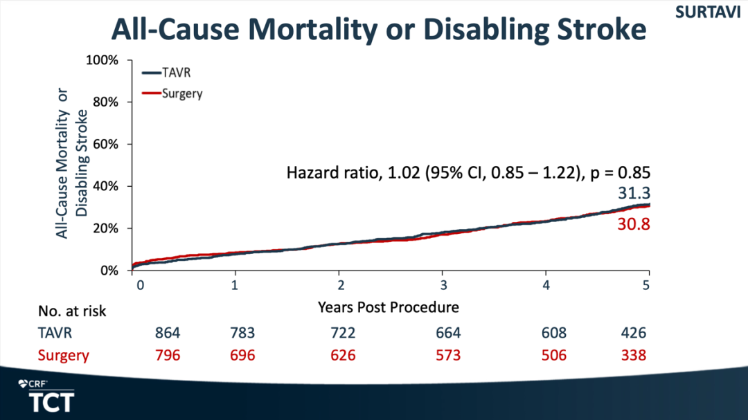 随访至5年时,两组的主要终点事件没有显著差异。其中TAVR组事件率为31.3%,手术组为30.8%(HR 1.02,95%CI [085-1.22],p=0.85)。进一步的界标分析显示,两组的主要终点在2年和2-5年间均无显著差异。子终点事件全因死亡和致残性卒中均在两组相当。