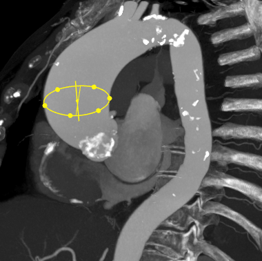 心脏CTA评估显示:Sievers 1型二叶式主动脉瓣,瓣叶明显增厚并重度钙化;瓣环周长82.7mm,瓣环面积534.9mm²;左冠状动脉开口高度12.6mm,右冠状动脉开口高度14.9mm;升主动脉最大直径60mm;横位心,瓣环角度60度。