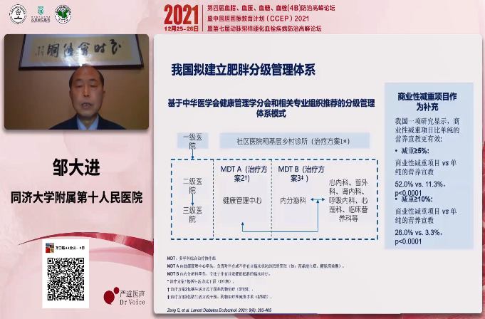 第四届血脂、血压、血糖、血栓(4B)防治高峰论坛暨中国胆固醇教育计划(CCEP)2021暨第七届动脉粥样硬化血栓病防治高峰论坛特设血糖论坛,同济大学附属第十人民医院邹大进教授基于CDS 2020《2型糖尿病防治指南》分享了体重管理的最新进展。