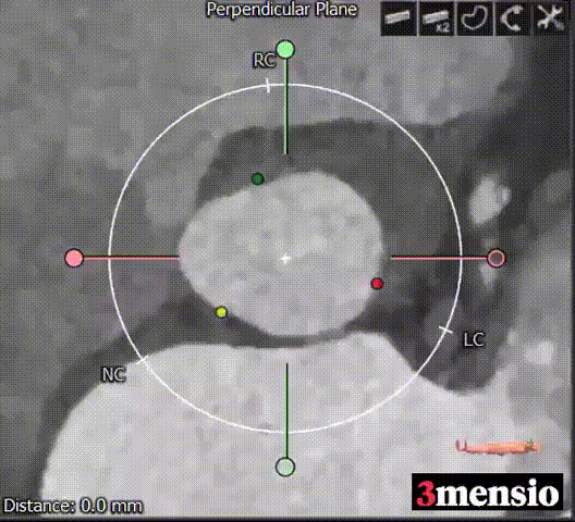 3.左冠开口高度稍低,瓣叶长、窦宽相对瓣膜可;右冠高度可,瓣叶长度可,冠脉风险低,术中球扩进一步评估。