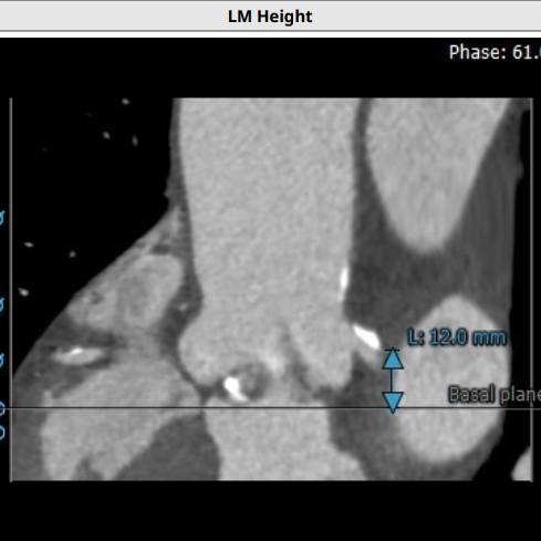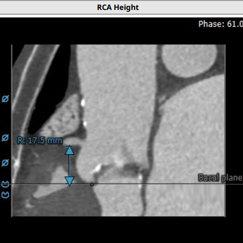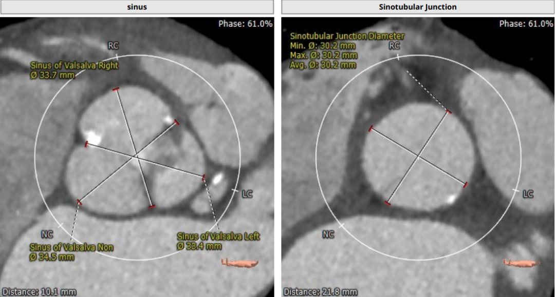 超声心动图显示,主动脉最大流速482cm/s,最大压差93mmHg,平均压差50mmHg,LVEF65%。CT显示主动脉瓣为TYPE2型二叶瓣,严重钙化,右无、左无可见粘连伴钙化,瓣环平面可见钙化,钙化延伸至流出道及二尖瓣前叶根部,左冠高度约12mm,瓣叶长度14.9mm,存在一定左冠风险,法式窦平均直径33.7mm,STJ高度约21.8mm、直径约30.2mm。