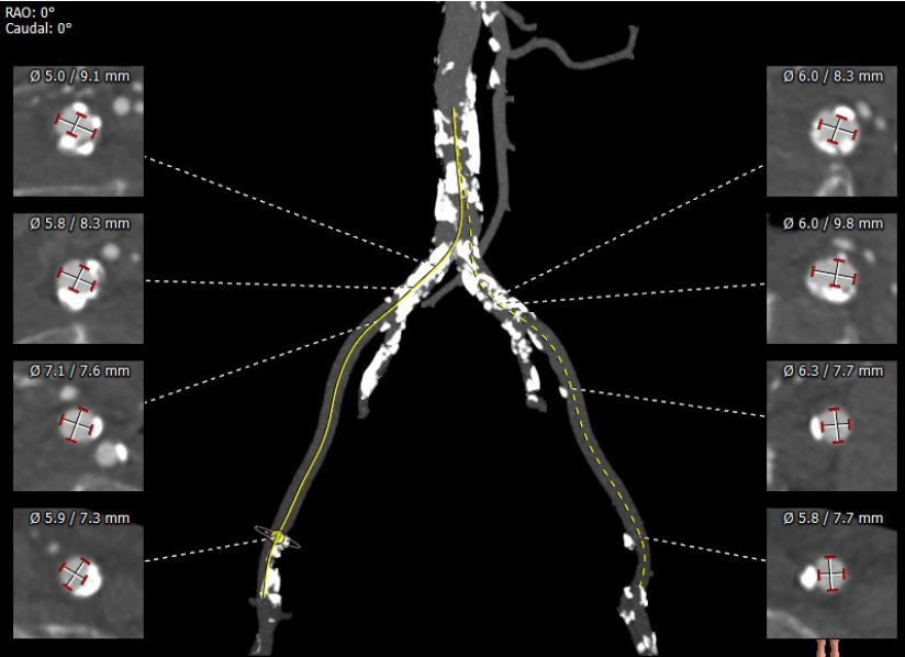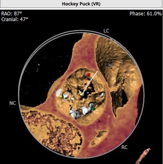 主动脉弓部走行较平缓,弓顶部可见少许钙化,主动脉弓部三根毛开口未见明显狭窄征象、未见发育变异,胸主动脉、腹主动脉走行较平直、腹主动脉多发严重钙化斑块,管腔未见明显狭窄,双侧髂动脉-股动脉走形迂曲,双侧髂动脉多发严重钙化斑块,部分呈半环形、马蹄形分布,右侧股动脉可尝试做为主入路,左股动脉作为脑保护入路。虚拟瓣环直径25mm,左室流出道平均直径23.3mm,拟植入VenusA Plus 23/26号的瓣膜。术中balloon sizing确认瓣膜型号,同时确认冠脉风险。