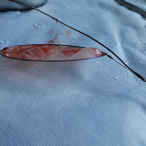 患者既往有COPD病史,且体重极低,为避免麻醉相关并发症,麻醉方式上选择局部麻醉。在左侧股动脉上下两个穿刺点行股动脉穿刺,上穿刺点置入6F鞘管,下穿刺点置入8F鞘管。右侧股动脉切开处送入20F大鞘。沿左股动脉8F鞘,交换送入TriGUARD3™脑保护装置,透视下顺利过弓,准确定位后成功释放过滤器,全部覆盖主动脉弓的三条血管。经TriGUARD3™送入5F猪尾至升主动脉。