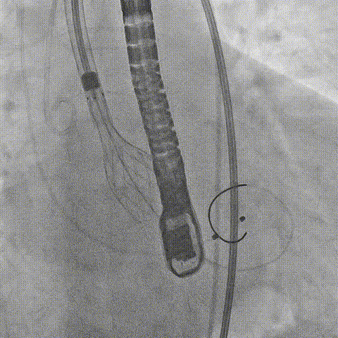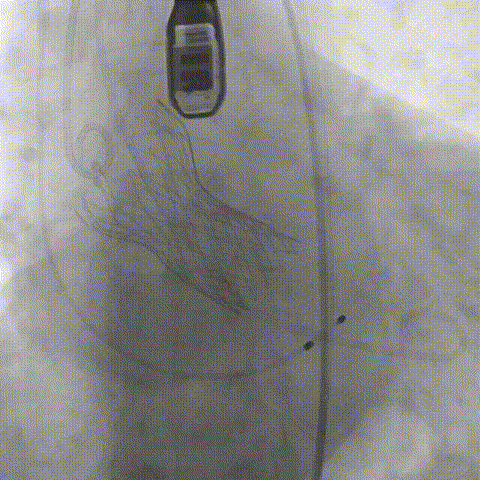 TaurusElite输送系统柔顺过弓跨瓣后,第一次AV23瓣膜瓣环平面上2mm定位释放,到工作位后造影评估瓣膜形态、发现无冠窦支撑力不够理想瓣膜完全释放有上跳风险,于是决定回收瓣膜,调整瓣膜定位,重新释放;