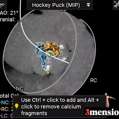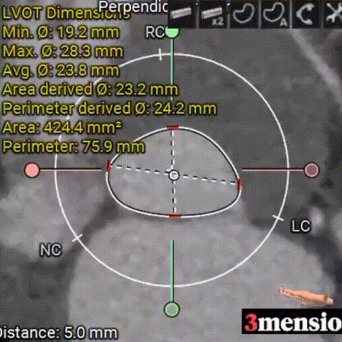 2.冠脉开口高度尚可,左冠瓣叶稍冗长,切线位左冠瓣叶长度稍大于冠脉开口到瓣叶根部附着缘距离,综合分析冠脉堵塞风险尚可,术中密切关注冠脉血流灌注;