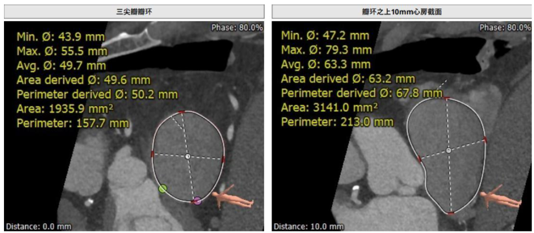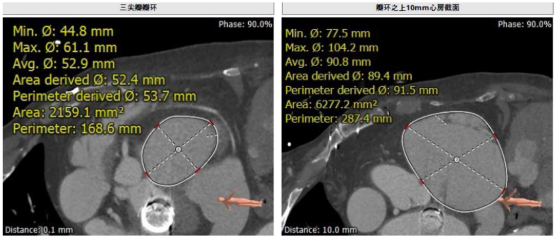 接受治疗的是三例重度三尖瓣反流患者,术前基础疾病多,均患有严重心律失常,其中两例患者NYHA心功能Ⅱ/Ⅲ级。结合术前CT评估结果,三例患者的自体瓣环都较大(图1-3),最大者平均瓣环为53.7mm;有一例患者有起搏器植入史,术中操作有缠绕起搏器导线的风险;三例患者入路血管均无严重迂曲和钙化。经术前讨论分析,潘湘斌教授及其团队潘家华教授、朱达教授、王首正教授以及心超室的骆志玲教授,董念国教授及其团队谢明星教授、尚小珂教授、陈澍教授、钟禹成教授经过讨论决定,采用创新的 LuX-Valve Plus经血管三尖瓣置换系统对患者进行手术。LuX-Valve Plus是我国自主研发的经血管介入三尖瓣置换系统,经颈静脉入路的微创方式可进一步降低对患者的创伤。