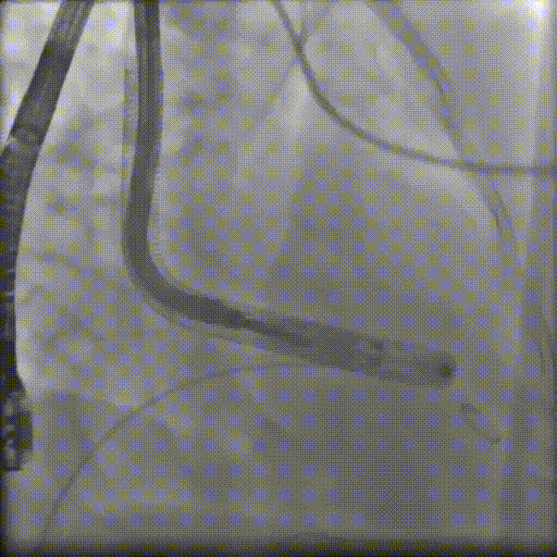 手术在全麻状态下进行,采用经右侧颈静脉入路,在TEE和DSA的指引下缓慢送入输送器进入体内,进入右室后释放室间隔锚定装置,旋转输送器,使得锚定装置对准室间隔面;释放前瓣夹持件,确定夹持件位于右室侧后释放人工瓣膜盘片,DSA及超声确认盘片位于右房侧,并适时调整瓣膜的同轴性。在DSA和超声的监视下调整室间隔锚定件贴合室间隔,释放室间隔锚定装置。再次确认瓣膜的稳定性和同轴性后,将输送器撤出体内,最终完成瓣膜植入(图4-5),手术室即刻拔除气管插管。术后超声提示人工三尖瓣同轴性良好,瓣架固定牢靠,无反流和瓣周漏,术后三尖瓣平均跨瓣压差显著降低。