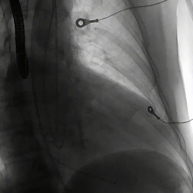 3.直头导丝跨瓣,通过交换导丝将猪尾导管引入左室,测得平均跨瓣压差约77mmHg;