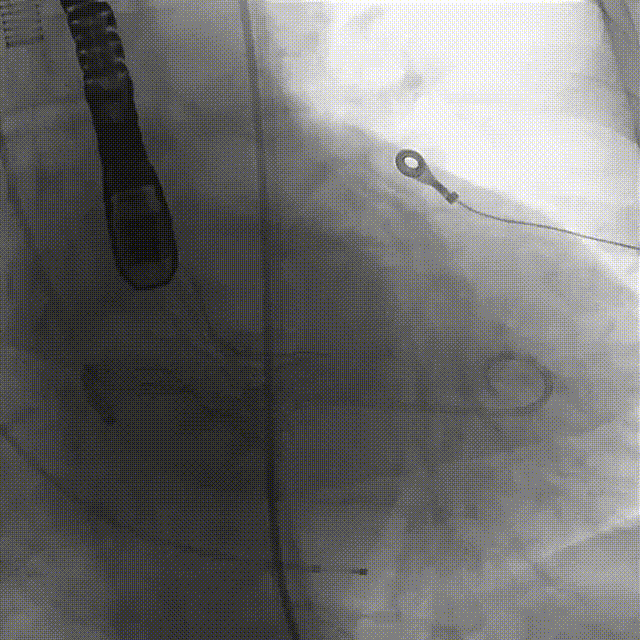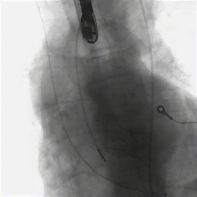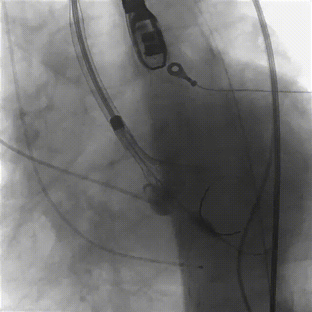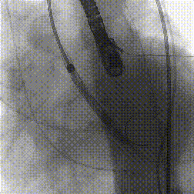 (2)由于患者升主动脉严重扩张,血管并发症风险较高,术中提前将抓捕器备于瓣膜输送系统上,直接于抓捕器辅助下送入瓣膜。得益于良好的控制,基本未使器械与扩张的血管壁接触,极大减少了血管并发症风险。