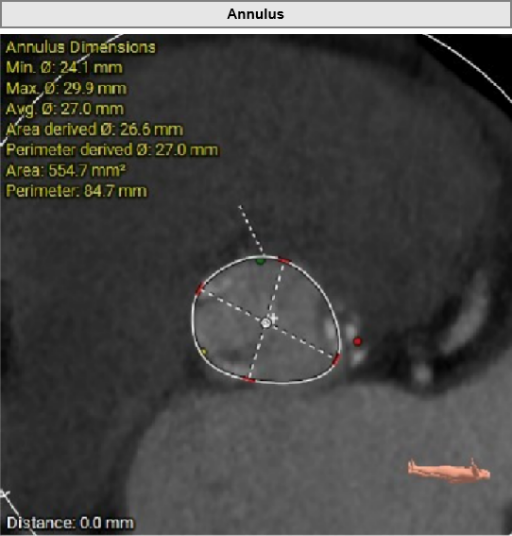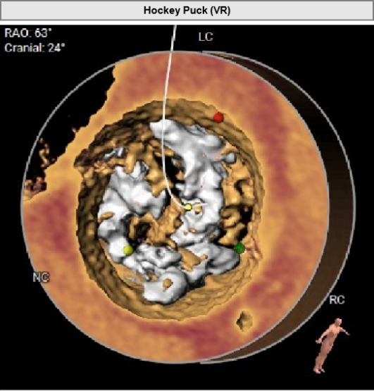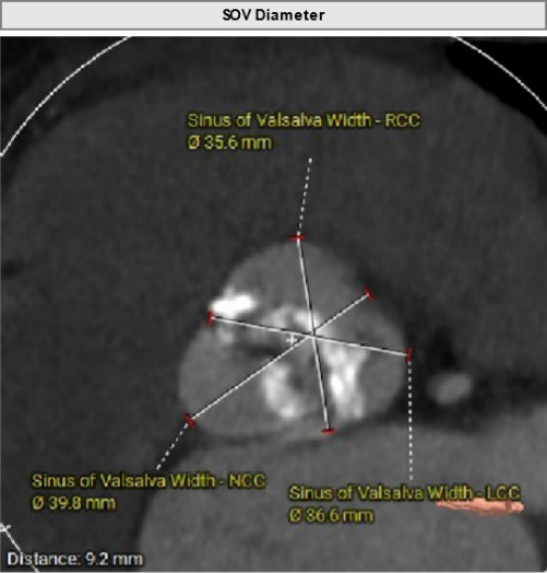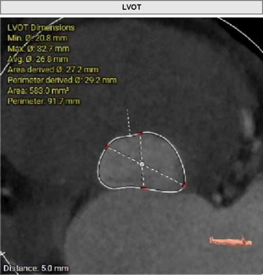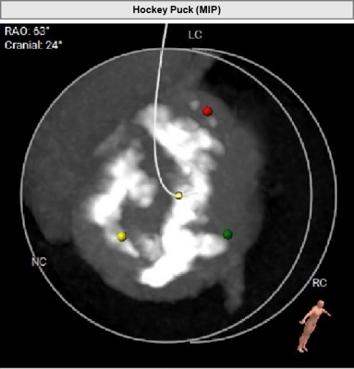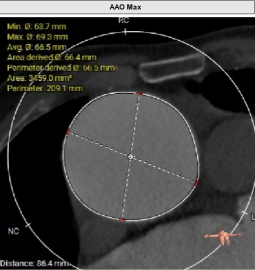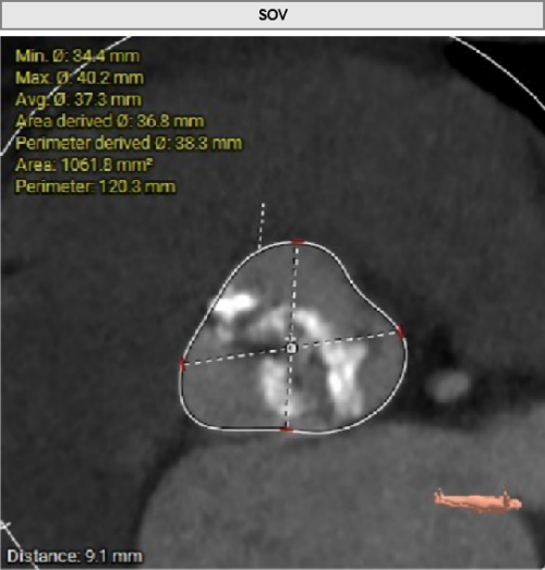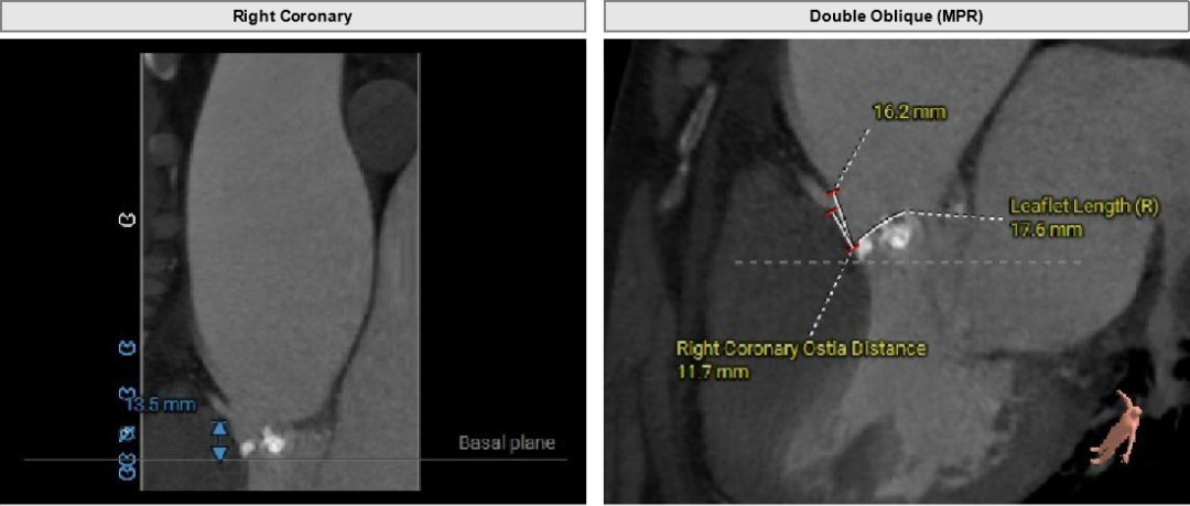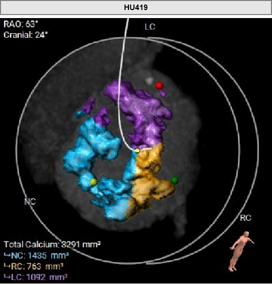 主动脉根部极重度钙化,预估瓣膜受限严重,植入后可能存在钙化导致的瓣周漏;