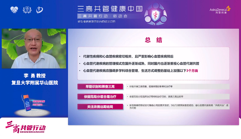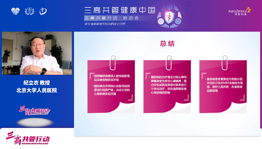 最后,陈璐璐教授对今天的会议进行了总结,再次强调“三高共管行动”项目积极响应国家相关政策,对于探索“三高共管”新模式具有极其重要的意义,相信在国家卫健委的指导下,在各位专家的共同努力和社会各界的大力支持下,“三高共管行动”定能大力推动我国三高共管进程,改善三高患者的防控现状,为早日实现健康中国2030宏伟目标增砖添瓦!