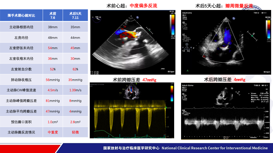 手术进行很顺利,器械操作顺畅。术后造影显示,瓣膜工作状态良好,无明显瓣周漏及跨瓣压差。冠脉无阻塞,无传导阻滞。患者顺利转回监护室苏醒。手术当天晚上开始开放饮食。术后第三天即转至普通病房,开始下床活动,同期开始进行计划性术后心脏康复锻炼。