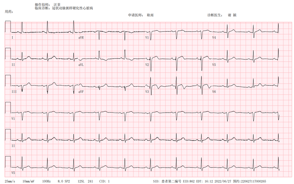 这是一位84岁高龄的男性患者,主因“发作性胸痛25年,再发1个月”入院。患者1997年因突发胸痛就诊于北京某三甲医院,考虑为“急性心肌梗死”,行急诊冠脉造影于前降支植入3枚支架。2005年活动后胸痛,再次冠脉造影,发现前降支支架内再狭窄,再次植入2枚支架。此后规律冠心病二级预防。1个月来患者反复出现活动后胸痛、气短等症状。入院后主要化验检查:TnT-hs 0.0202ng/ml(正常<0.014ng/ml);LDL-C 3.97mmol/L;甲状腺功能正常;NT-pro BNP 505pg/ml;Hb A1c 5.8%;eGFR 60.744。入院后心电图如下图1。