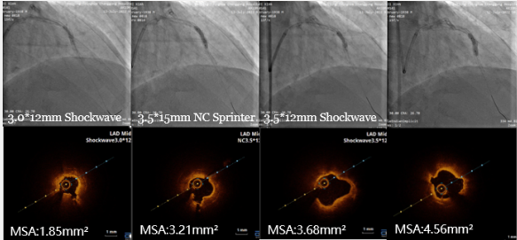 随后,我们选择3.0*12mm Shockwave冲击波球囊通过LAD支架内再狭窄伴钙化病变部位,根据标准操作流程,球囊压力充盈至4atm,先后触发80次脉冲击波(8个周期),实施钙化斑块碎裂术,并间断将球囊充盈压升至6atm维持10秒左右,对治疗段进行低压球囊扩张成形,随后通过OCT及冠脉造影融合技术证实, MSA:1.85mm²,支架内钙化环被打开,震波深达0.52mm,换用3.5*15mm NC 耐高压球囊以20-24atm扩张后,测得MSA:3.21mm²,扩张仍然不理想。介入团队经商定后,决定更换3.5*12mm Shockwave 冲击波球囊再次进行8次周期的斑块碎裂术,事后以3.0-3.25-3.5mm NC球囊高压充分高压扩张,通过OCT证实MSA达到4.56mm²(如图6,7)。造影提示支架内血流通畅,残余狭窄<10%,前向血流恢复TIMI 3级,最终结果如图8。患者术后胸痛症状明显缓解,安全出院。