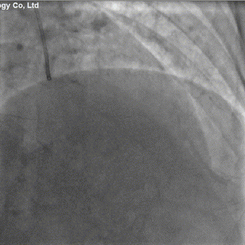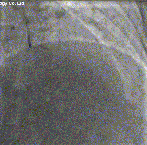 选用谱创医疗2.5mm*12mm Sonico-CX冠脉血管冲击波球囊于前降支近、中段钙化病变处,先后触发60次冲击波(6个周期;每个周期分别以4atm激发10个脉冲冲击波,再加压至8atm扩张成形)实施钙化斑块碎裂术,DSA下可见随着冲击波释放,并经8atm扩张后,钙化最严重处球囊扩张充分。