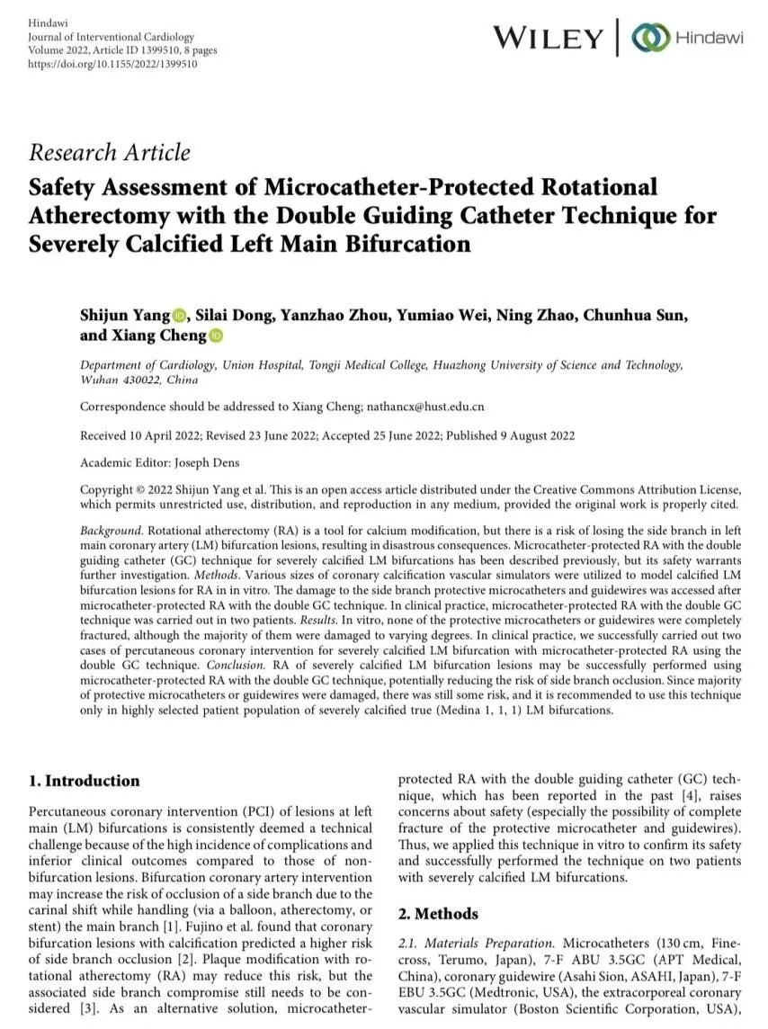 2022年8月9日, 华中科技大学同济医学院附属协和医院心血管内科程翔教授团队在Journal of Interventional Cardiology(《介入心脏病学杂志》)上发表题为 “Safety Assessment of Microcatheter-Protected Rotational Atherectomy with the Double Guiding Catheter Technique for Severely Calcified Left Main Bifurcation”的文章,并获得Journal of Interventional Cardiology杂志网站首页重点推荐(图1),文章共同第一作者为杨仕俊医师、董思来医师、周彦兆医师和魏宇淼教授,通讯作者为程翔教授。(图2)