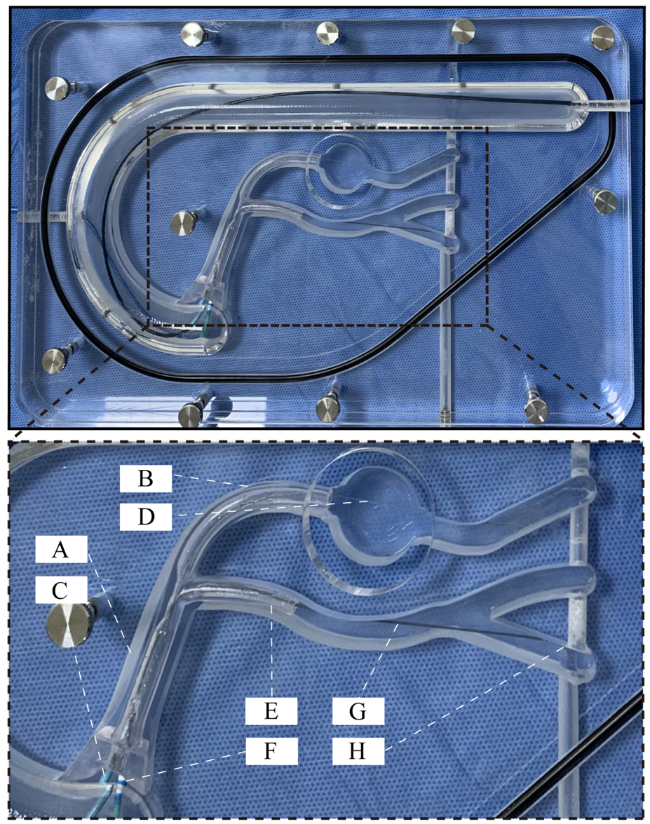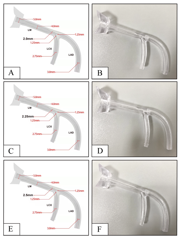 为了研究双指引导管微导管保护左主干钙化旋磨技术的安全性,程翔教授团队对此项技术进行了体外实验。研究者选用左主干末端管腔直径2.0mm、2.25mm和2.5mm,前降支/回旋支近端管腔直径1.25mm三种大小的冠脉钙化血管模拟器(图3)进行旋磨操作(图4)。体外实验证实,虽然大多数边支保护微导管和导丝会出现不同程度的损伤,但均未发生完全断裂,提示此项技术的相对安全性。