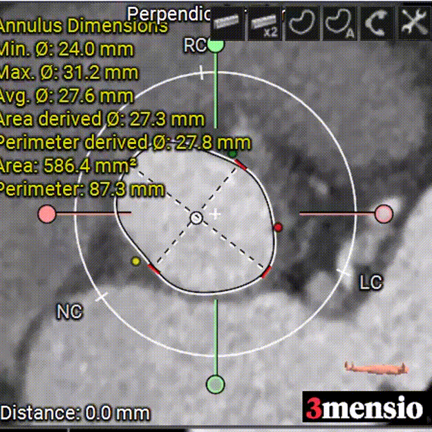 ● 左右冠脉开口高度尚可,切线位左右冠瓣叶长度>冠脉开口到瓣叶附着缘距离;