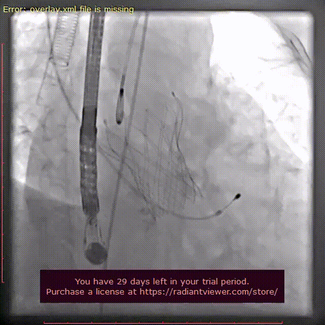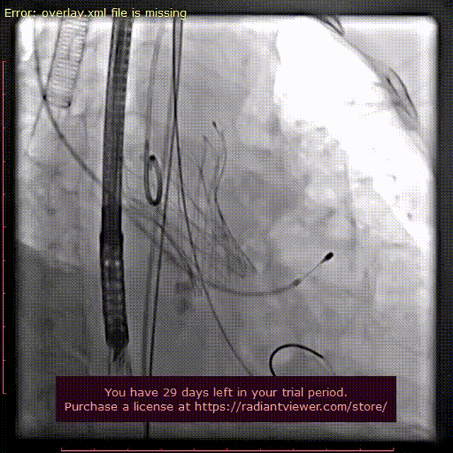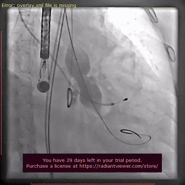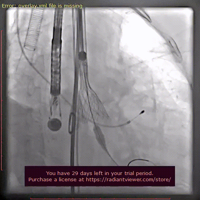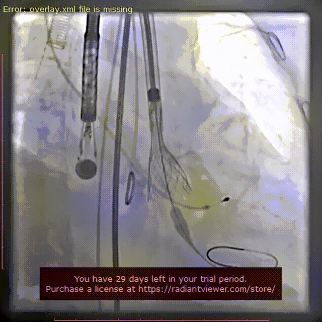 完全释放后位置良好,由于受重度钙化影响,瓣膜受到一定压缩,有轻-中瓣周漏,于是180次起搏下使用22mm球囊后扩,后扩完瓣膜形态良好。