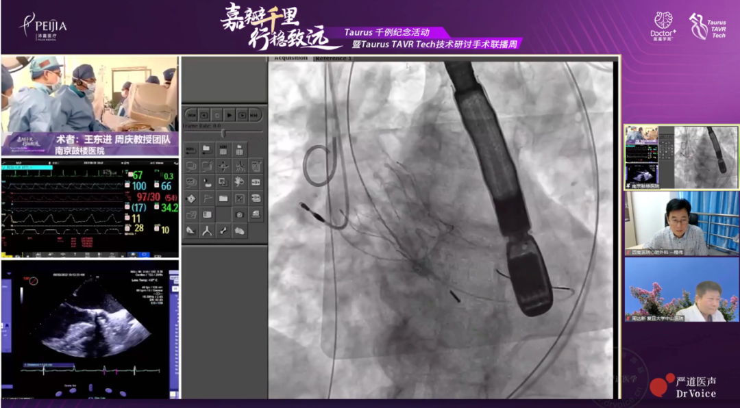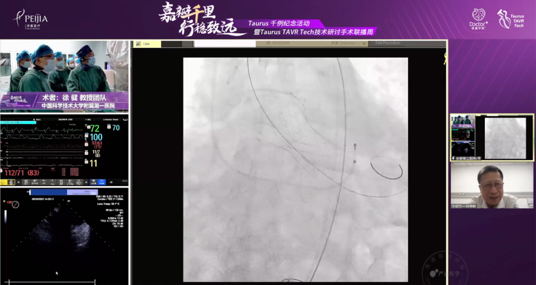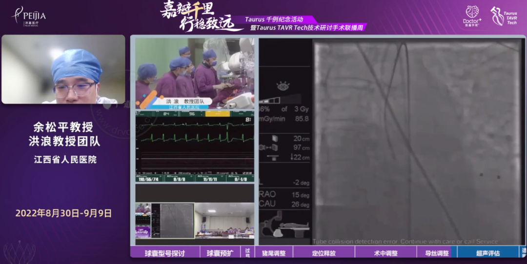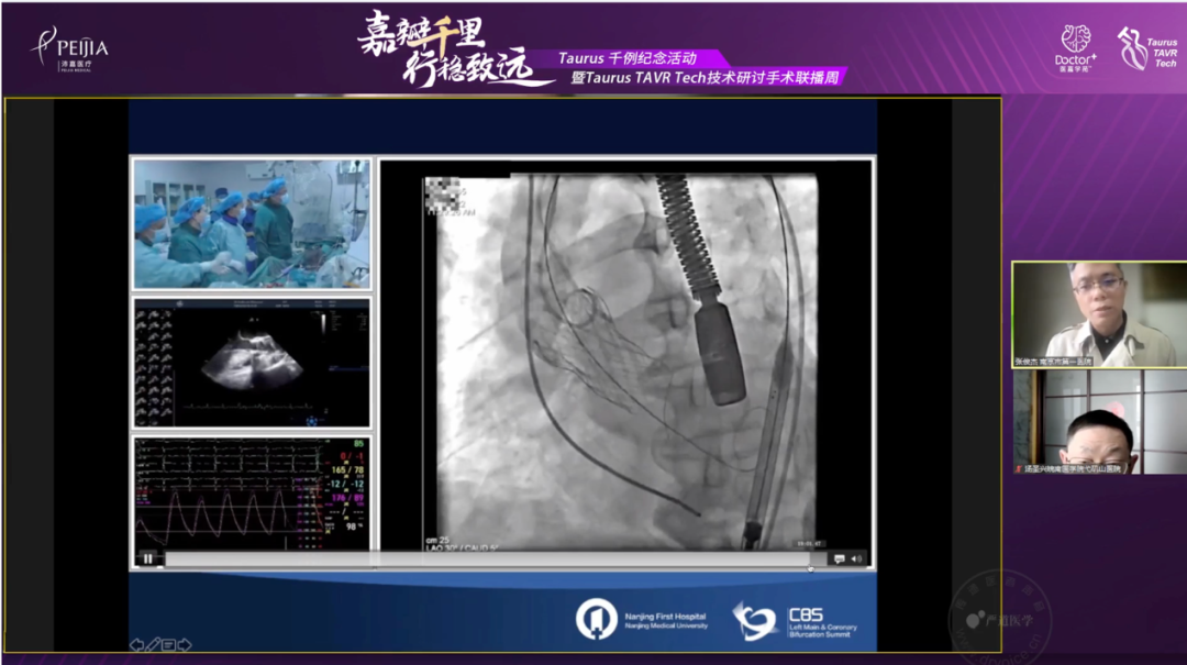 陆军军医大学第一附属医院程伟教授带来了第一台手术转播,该患者为77岁女性,COPD病史,Euroscore 8分,心超结果为主动脉瓣重度狭窄,为Type 0二叶瓣。第二台手术由南京大学医学院附属鼓楼医院王东进教授团队带来转播,周庆教授为第一术者,该患者为96岁男性,突发胸痛入院。主动脉瓣植入术、永久起搏器植入术后,现人工主动脉瓣重度反流。两台手术使用Taurus治疗均取得了满意疗效。转播结束后,与会专家们针对TAVR术前评估和球囊扩张展开了讨论,分享了许多宝贵经验。