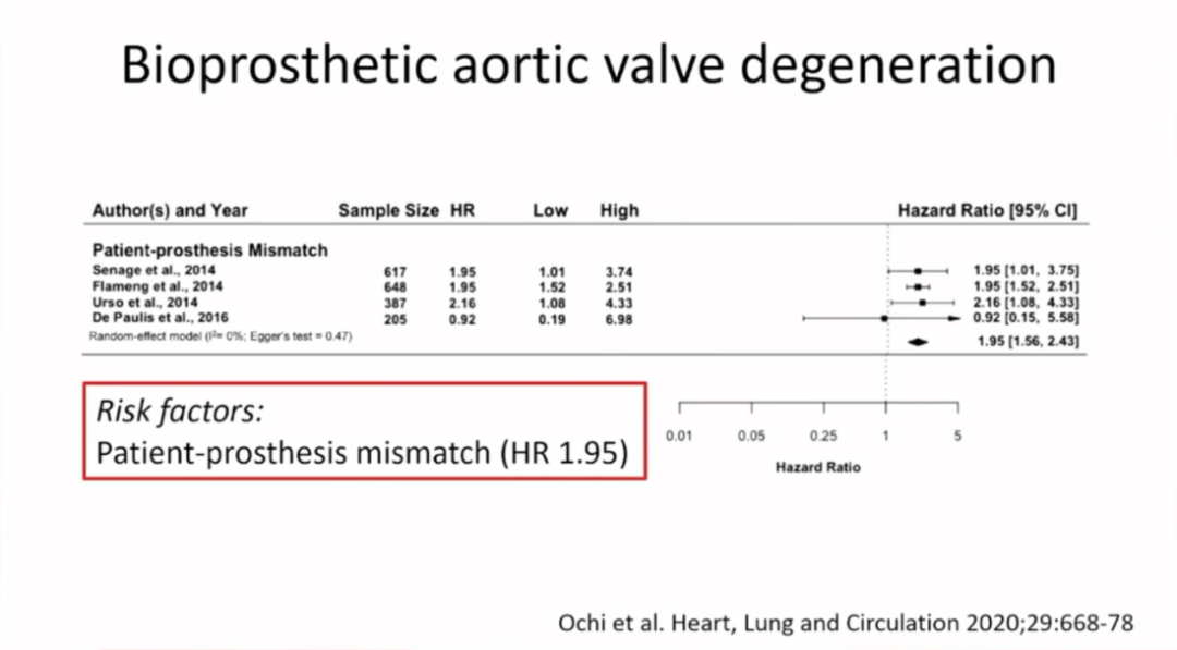 人工瓣膜-患者不匹配(PPM)是加速生物瓣衰败的独立危险因素(HR 1.95),常发生于小瓣环患者。相比无PPM的患者,发生PPM的患者的心血管相关死亡率要增加6倍。PPM一定程度上是可以避免的,如对小瓣环患者行主动脉根部扩大以植入更大型号的人工瓣膜,但目前仅有不到1%患者同期行主动脉根部扩大。