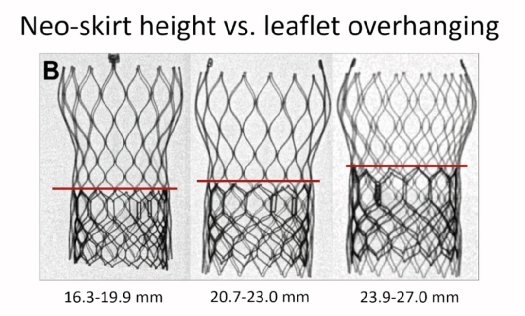 而当我们进行再次TAVI手术时,依然存在冠脉阻塞的风险。因为植入经导管支架瓣膜后会将原有的瓣叶推向远端形成新的裙边,再次植入新的经导管支架瓣膜又会形成更高的裙边,而裙边越高,冠脉阻塞风险越高,将来也就越难以进行冠脉介入治疗。Lars Sondergaard教授还指出,最新的研究发现,与其选择与前一次相同的经导管支架瓣膜,更建议选择短支架网孔大的球扩瓣。同时指出,球扩瓣植入越深,则新裙边越低,越方便进行冠脉介入。而当植入过深,再次植入瓣膜的支架深度就会超过原经导管瓣膜的植入深度,但从临床实践上并不影响临床结局。