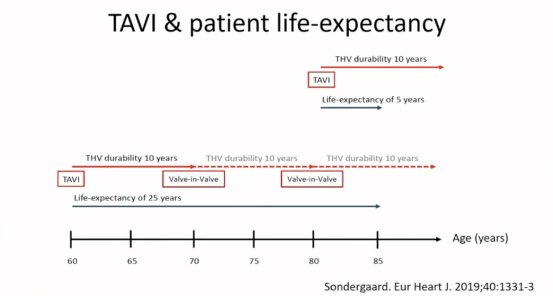 因目前尚不确定TAVI支架瓣膜的耐久性,假设其约为10年,对于80岁以上患者,其预期寿命在5年内,TAVI支架瓣膜可以满足要求。但如果60岁的患者接受TAVI,由于其预期寿命为25年,那么其余生可能还需要接受两次瓣中瓣手术。因此必须从终生管理的角度提前考虑这一因素。