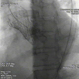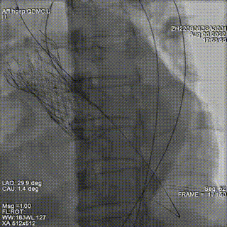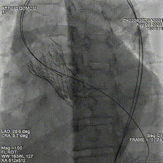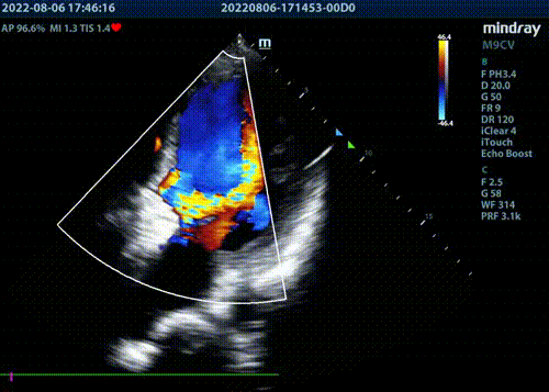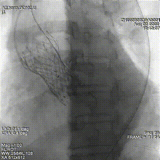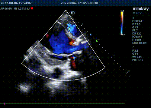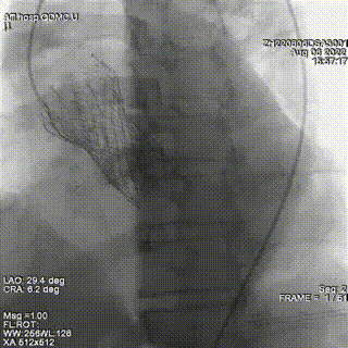 男,74岁,因主动脉瓣重度狭窄,Type 1型带嵴二叶瓣行TAVR手术治疗,瓣膜植入术后压差明显改善,但因瓣膜位置偏深瓣周反流植入瓣中瓣,术后患者恢复良好出院。随访中超声提示瓣周中重度反流,反流位于主动脉人工瓣瓣周右后方,LVEF:38%。