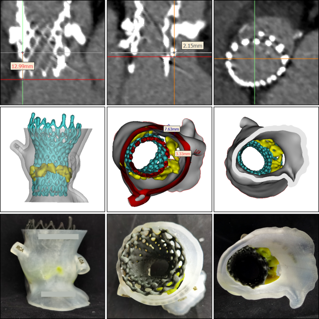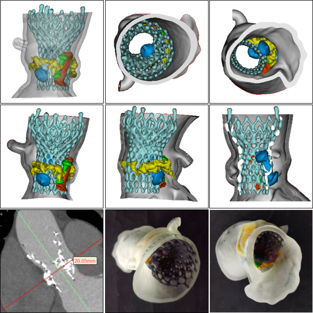 支架瓣膜位置良好。原瓣周漏位置,即左冠窦处植入3枚封堵器,形态良好,3D剖视图及打印模型可见瓣周漏封堵良好,无冠脉阻塞风险。