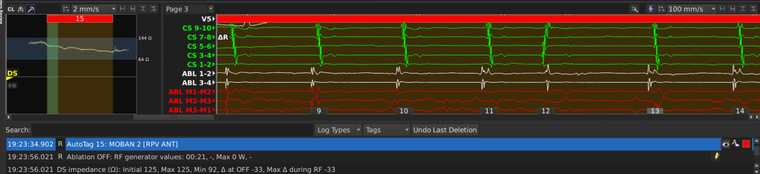4.消融过程示例:导管位于RIPV,贴靠稳定后初始阻抗约125Ω(较血池阻抗上升34Ω,电位明显,贴靠度良好),放电过程中,微电极上电位下降明显,阻抗下降33Ω,后稳定在平台期。