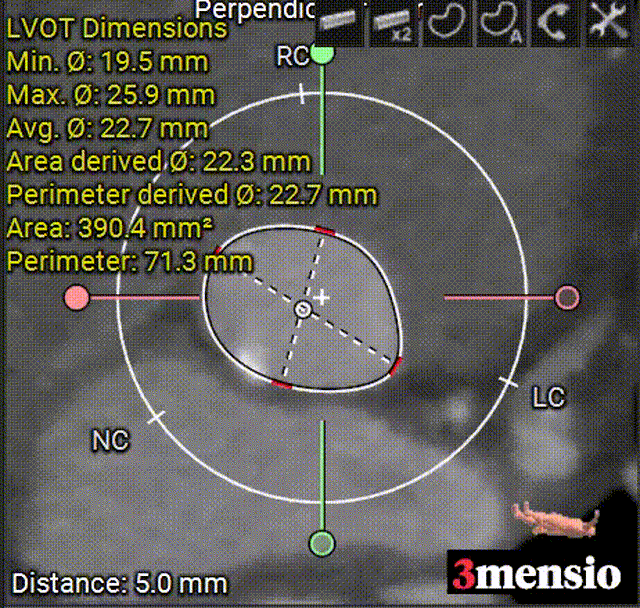 预装TaurusEliteAV23瓣膜,输送系统顺利过弓、跨瓣,初始于瓣环平面下2mm精准定位释放,释放过程中瓣膜锚定出现下滑。