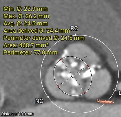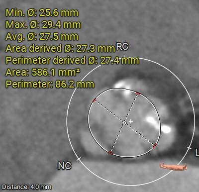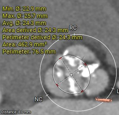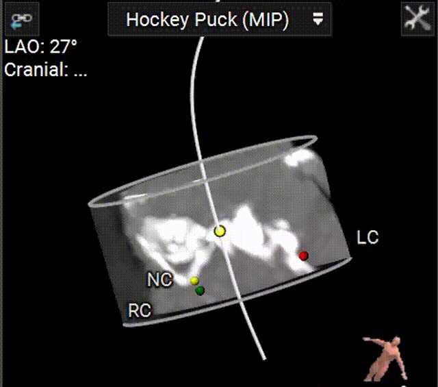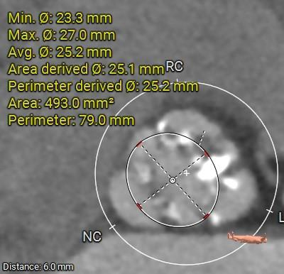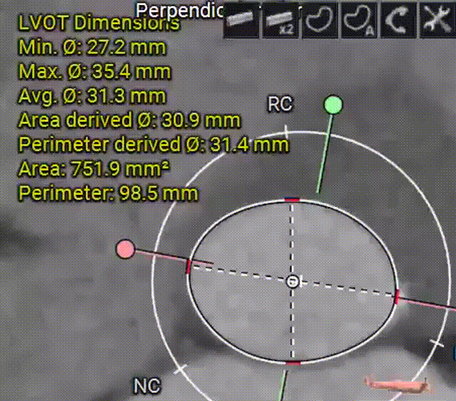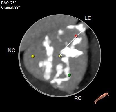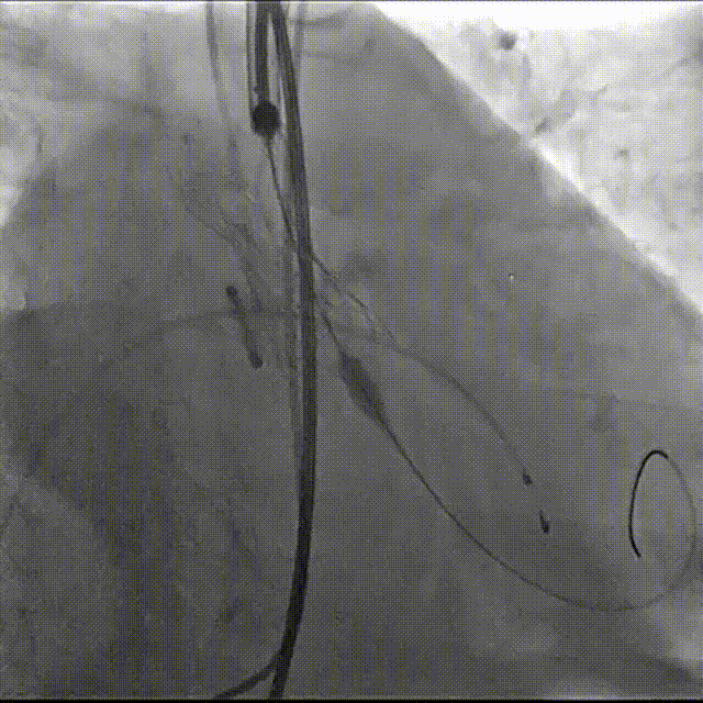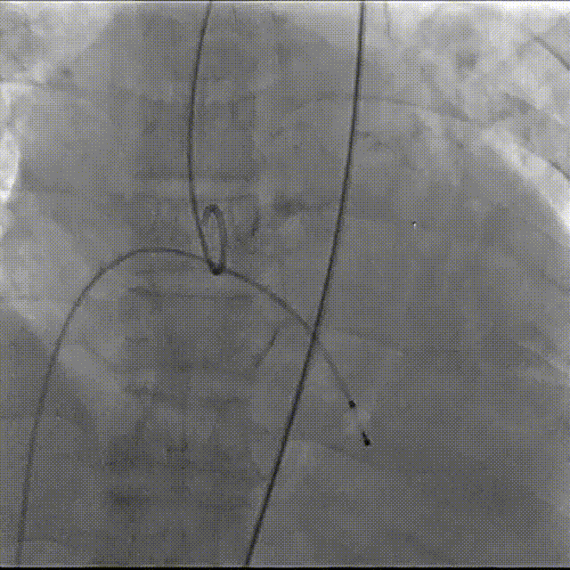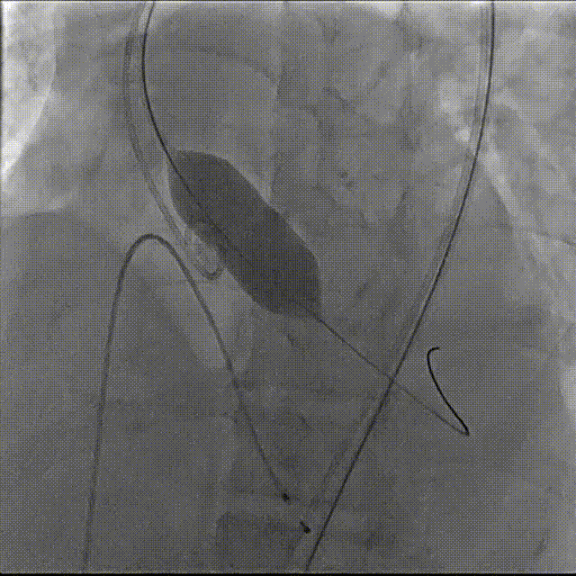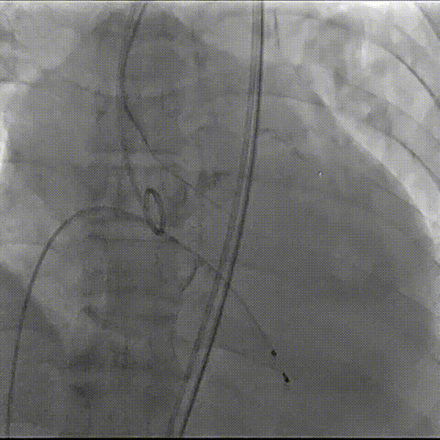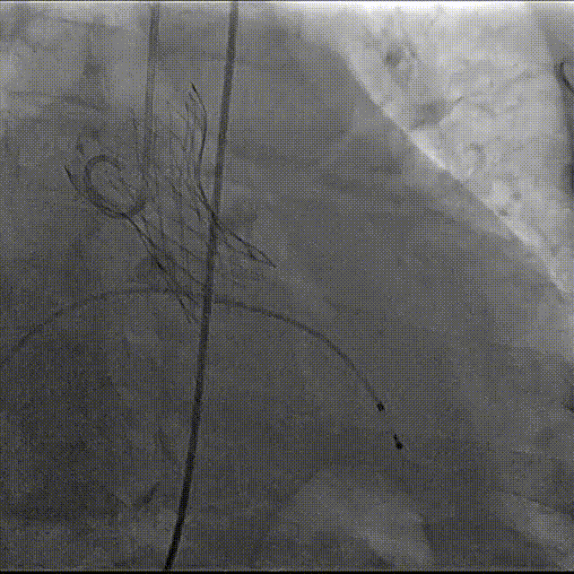 3.使用23mm球囊预扩,预装AV29瓣膜,瓣上2mm开始释放。